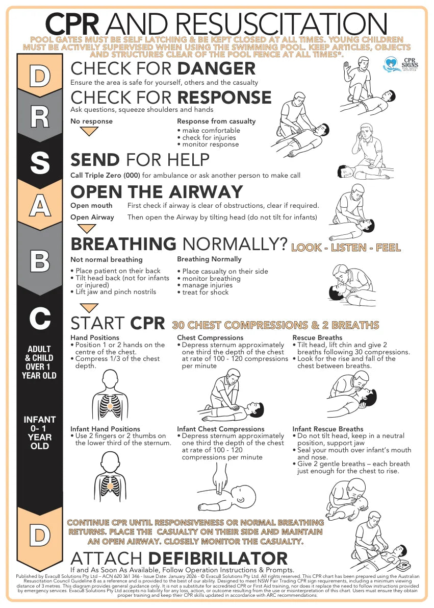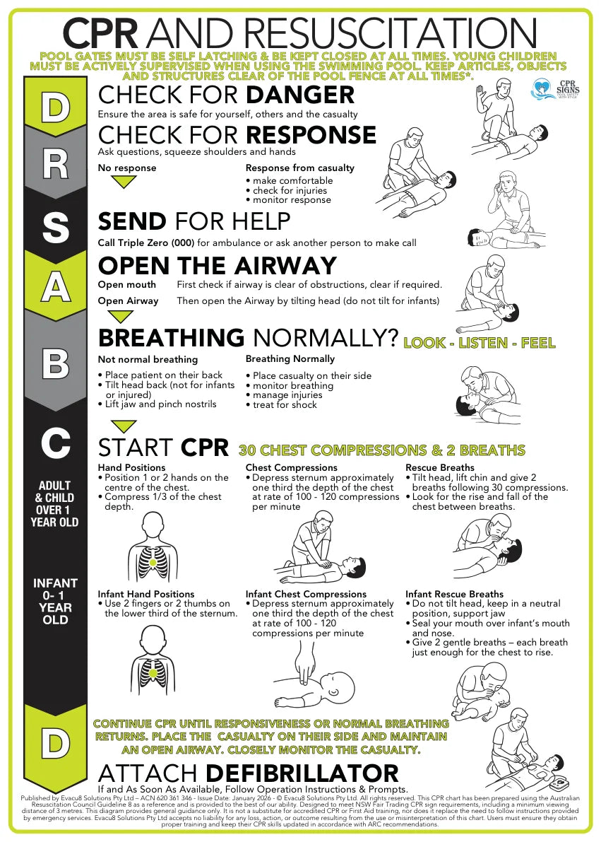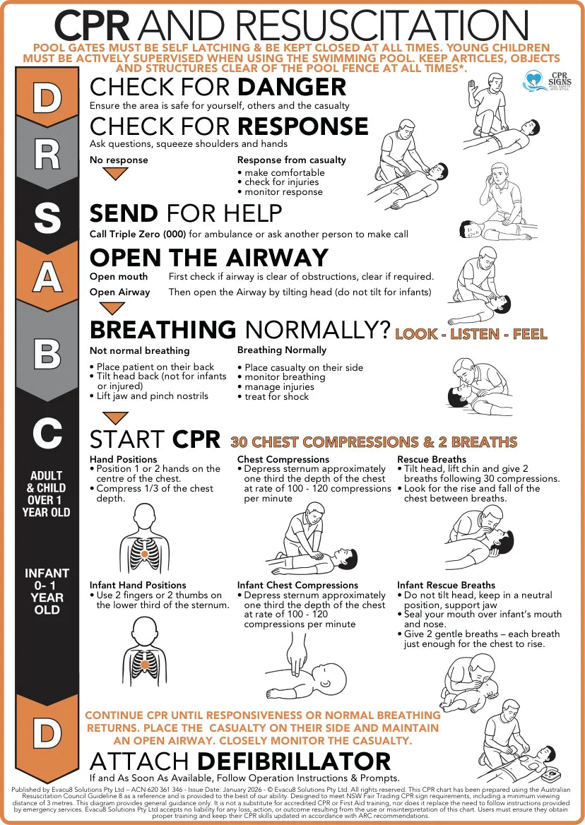 NSW: Must display a resuscitation chart and warning sign that complies with Australian Standards.